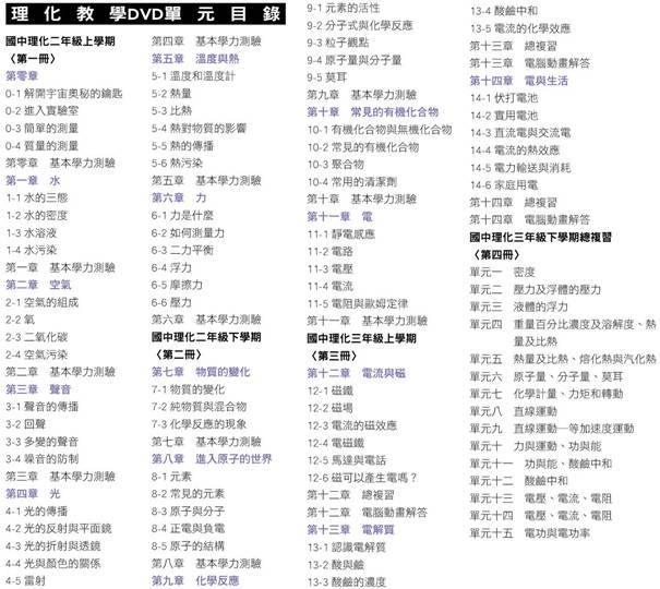 2013年7月 聯考必勝 劉國興老師 國中理化高分必備 第二冊總復習(二下) 繁體中文教學合輯版(DVD3片裝) -=-=-=-=-=-=-=-=-=-=-=-=-=-=-=-=-=-=-=-=-=-=-=-=-=-=-=-=-=-=-=-=-=-=-=-= 軟體名稱:2013年7月 聯考必勝 劉國興老師 國中理化高分必備 第二冊總復習(二下) 繁體中文教學合輯版(DVD3片裝) 語系版本:繁體中文教學合輯版 光碟片數:3片裝 破解說明: 系統支援:Windows 7/XP/Vista/DVD 播放機 軟體類型:繁體中文教學合輯版 硬體需求:PC,DVD 播放機 更新日期:2013-07-25 官方網站: 中文網站: 軟體簡介: 銷售價格:$540元 -=-=-=-=-=-=-=-=-=-=-=-=-=-=-=-=-=-=-=-=-=-=-=-=-=-=-=-=-=-=-=-=-=-=-=-=     軟體簡介: 國二下學期(第二冊)<8年級下學期> 第一片DVD內容 第一卷 物質的變化 第二卷 化學反應的現象(包括氧化還原+可逆反應+反應速率及平衡) 第三卷 元素 第四卷 常見的元素 第五卷 原子與分子 共約5個小時課程 第二片DVD內容 第六卷 生電與負電 第七卷 元素的活性 第八卷 分子式與化學反應 第九卷 粒子觀點 第十卷 莫耳 共約5個小時課程 第三片DVD內容 第十一卷 有機化合物與無機化合物 第十二卷 靜電感應 第十三卷 電壓 第十四卷 電流 第十五卷 電阻與歐姆定律 共約5個小時課程 共3片DVD影音光碟 -=-=-=-=-=-=-=-=-=-=-=-=-=-=-=-=-=-=-=-=-=-=-=-=-=-=-=-=-=-=-=-=-=-=-=-=